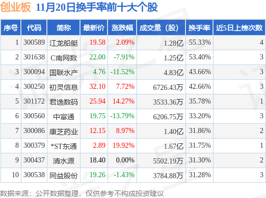 当日创业板换手率前10大个股中5只个股收涨,平均涨幅10.59%,其中江龙船艇(300589)以换手率55.33%排第一,8只个股近5个交易日中多次上榜。