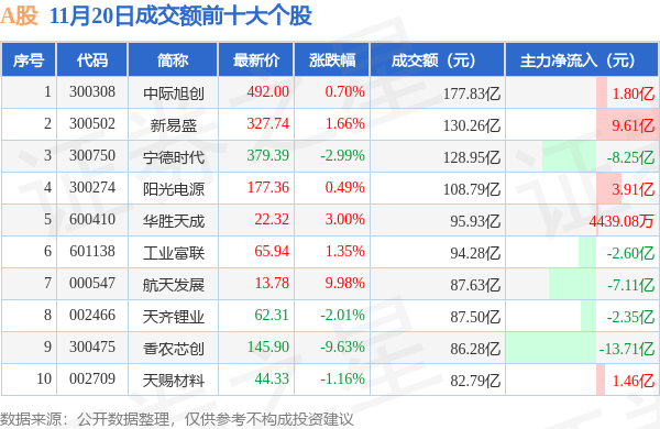 当日A股成交额前10大个股中6只个股收涨,平均涨幅2.86%,其中中际旭创(300308)以成交额177.83亿元排第一。从主力资金流入看,成交额前10大个股中有5只个股呈现主力资金净流入。