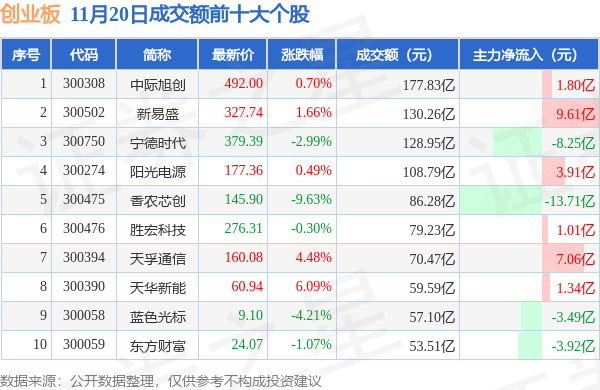 当日创业板成交额前10大个股中5只个股收涨,平均涨幅2.68%,其中中际旭创(300308)以成交额177.83亿元排第一。从主力资金流入看,成交额前10大个股中有6只个股呈现主力资金净流入。