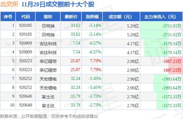 当日北交所成交额前10大个股中2只个股收涨,平均涨幅7.79%,其中贝特瑞(920185)以成交额5.29亿元排第一。从主力资金流入看,成交额前10大个股中有2只个股呈现主力资金净流入。