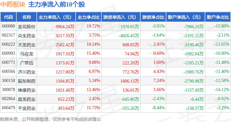 从资金流向上来看,当日中药板块主力资金净流出1.43亿元,游资资金净流入1005.09万元,散户资金净流入1.33亿元。中药板块个股资金流向见下表:
