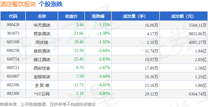 从资金流向上来看,当日酒店餐饮板块主力资金净流出1.13亿元,游资资金净流出337.11万元,散户资金净流入1.16亿元。酒店餐饮板块个股资金流向见下表: