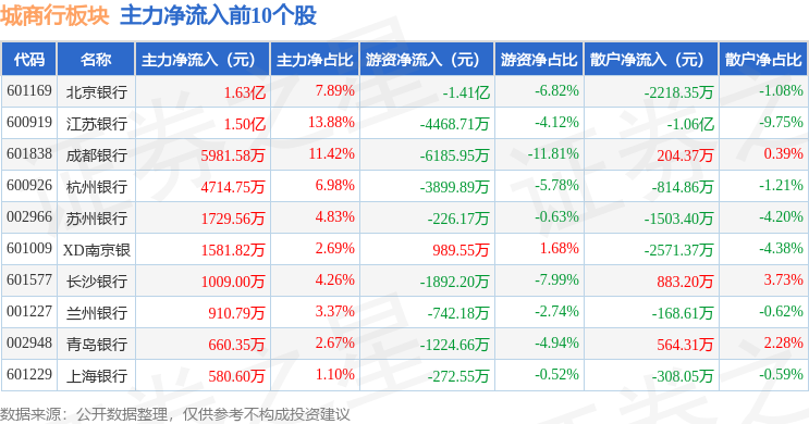 从资金流向上来看,当日城商行板块主力资金净流入4.21亿元,游资资金净流出3.56亿元,散户资金净流出6490.74万元。城商行板块个股资金流向见下表: