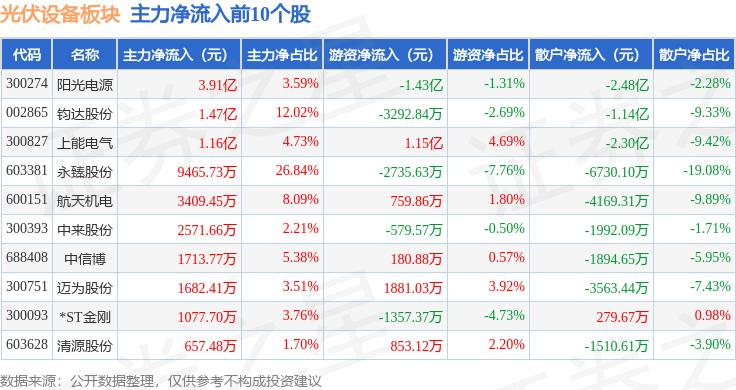 从资金流向上来看,当日光伏设备板块主力资金净流出19.65亿元,游资资金净流入2.18亿元,散户资金净流入17.47亿元。光伏设备板块个股资金流向见下表: