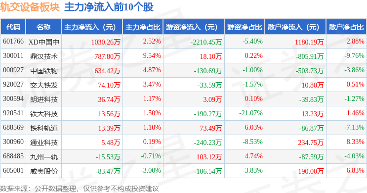 从资金流向上来看,当日轨交设备板块主力资金净流出1.3亿元,游资资金净流入3394.08万元,散户资金净流入9574.95万元。轨交设备板块个股资金流向见下表: