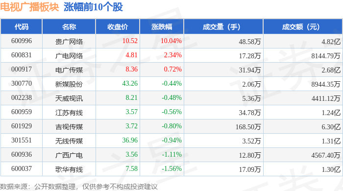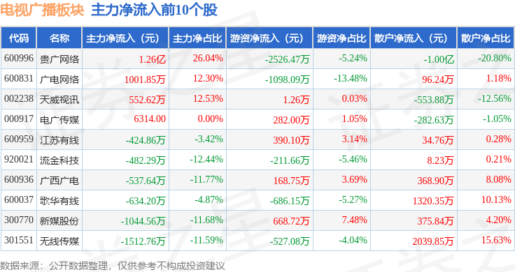 从资金流向上来看,当日电视广播板块主力资金净流出1.86亿元,游资资金净流出4966.95万元,散户资金净流入2.36亿元。电视广播板块个股资金流向见下表: