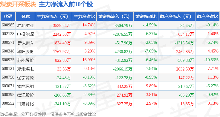从资金流向上来看,当日煤炭开采板块主力资金净流出5.64亿元,游资资金净流出1572.3万元,散户资金净流入5.8亿元。煤炭开采板块个股资金流向见下表: