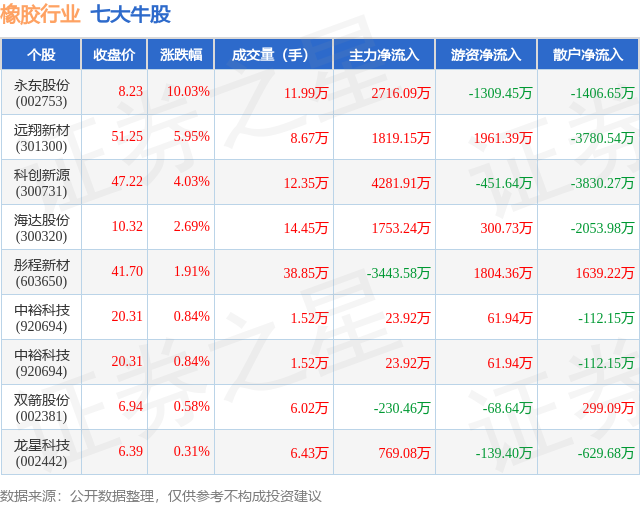 个股表现方面,橡胶行业当日领涨股为永东股份(002753),该股当日报收8.23,上涨10.03%,成交量11.99万,主力资金净流入2716.09万元。远翔新材(301300)以上涨5.95%紧随其后,该股当日成交量8.67万,主力资金净流入1819.15万元。除此之外,科创新源(300731)、海达股份(300320)、彤程新材(603650)均进入当日牛股之列。具体个股列表见下表: