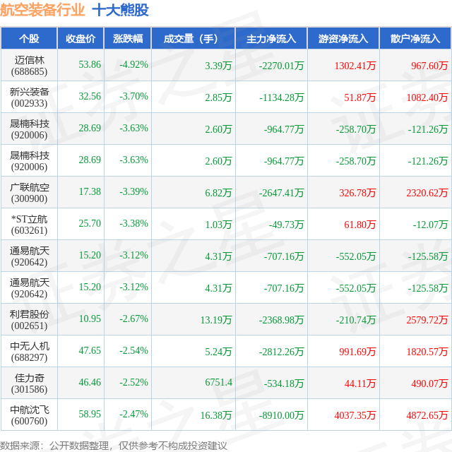 个股表现方面,航空装备行业当日领跌股为迈信林(688685),该股当日报收53.86,下跌4.92%,成交量3.39万,主力资金净流出2270.01万元。新兴装备(002933)以下跌3.7%紧随其后,该股当日成交量2.85万,主力资金净流出1134.28万元。除此之外,晟楠科技(920006)、晟楠科技(920006)、广联航空(300900)均进入当日熊股之列。具体个股列表见下表: