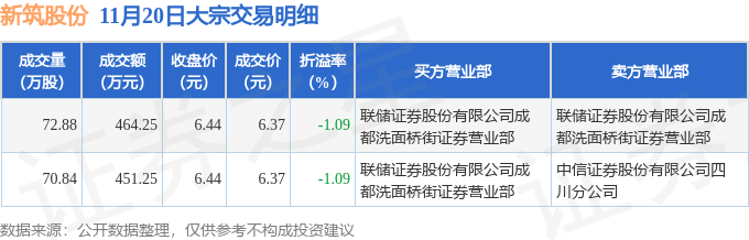 证券之星消息,11月20日新筑股份发生大宗交易,交易数据如下: