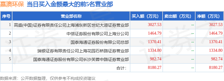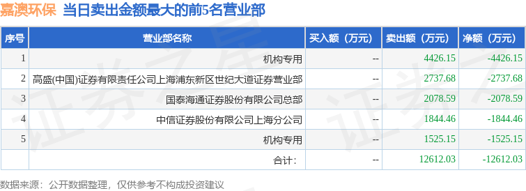 证券之星消息,沪深交易所2025年11月20日公布的交易公开信息显示,嘉澳环保(603822)因有价格涨跌幅限制的日收盘价格跌幅偏离值达到7%的前五只证券登上龙虎榜。此次是近5个交易日内第1次上榜。