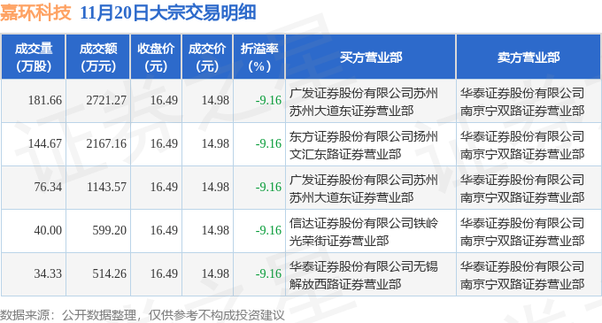 证券之星消息,11月20日嘉环科技发生大宗交易,交易数据如下: