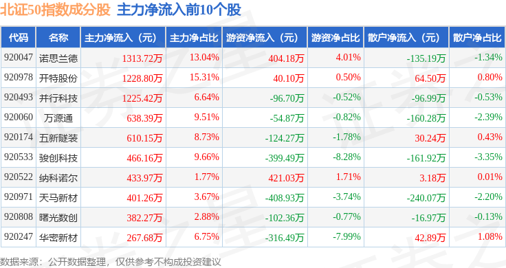 资金流向方面,北证50(899050)指数成份股当日主力资金净流出合计1.54亿元,游资资金净流出合计1.56亿元,散户资金净流出合计2265.13万元。成份股资金流向详情见下表: