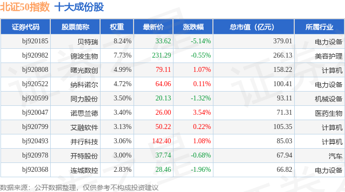 证券之星消息,11月20日,北证50(899050)指数报收于1445.54点,跌1.07%,成交146.1亿元,换手率2.75%。当日该指数成份股中,上涨的有18家,诺思兰德以3.54%的涨幅领涨,下跌的有32家,安达科技以6.57%的跌幅领跌。