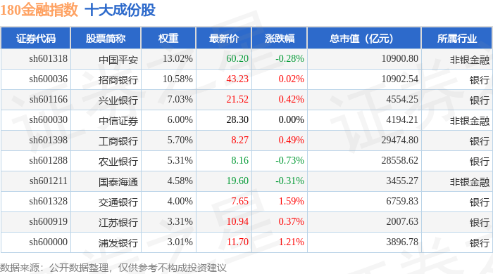 证券之星消息,11月20日,180金融(000018)指数报收于5895.34点,涨0.39%,成交588.77亿元,换手率0.45%。当日该指数成份股中,上涨的有30家,中国银行以4.0%的涨幅领涨,下跌的有8家,华泰证券以2.57%的跌幅领跌。