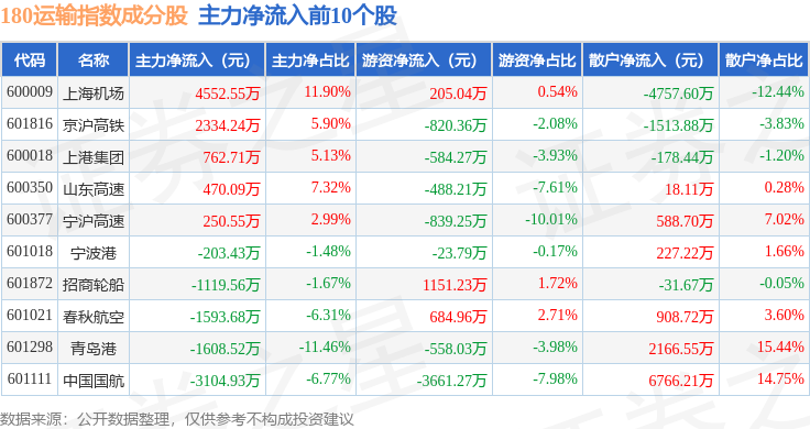 资金流向方面,180运输(000027)指数成份股当日主力资金净流出合计1.27亿元,游资资金净流入合计2954.63万元,散户资金净流入合计9786.57万元。成份股资金流向详情见下表: