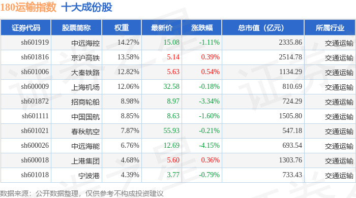 证券之星消息,11月20日,180运输(000027)指数报收于778.86点,跌0.83%,成交46.38亿元,换手率0.31%。当日该指数成份股中,上涨的有4家,山东高速以1.06%的涨幅领涨,下跌的有9家,中远海能以4.15%的跌幅领跌。