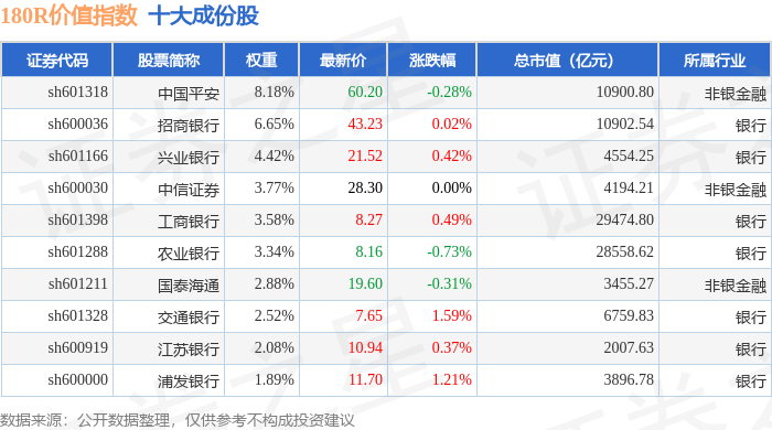 证券之星消息,11月20日,180R价值(000031)指数报收于3272.58点,跌0.07%,成交1475.92亿元,换手率0.47%。当日该指数成份股中,上涨的有56家,中国银行以4.0%的涨幅领涨,下跌的有65家,大全能源以6.7%的跌幅领跌。