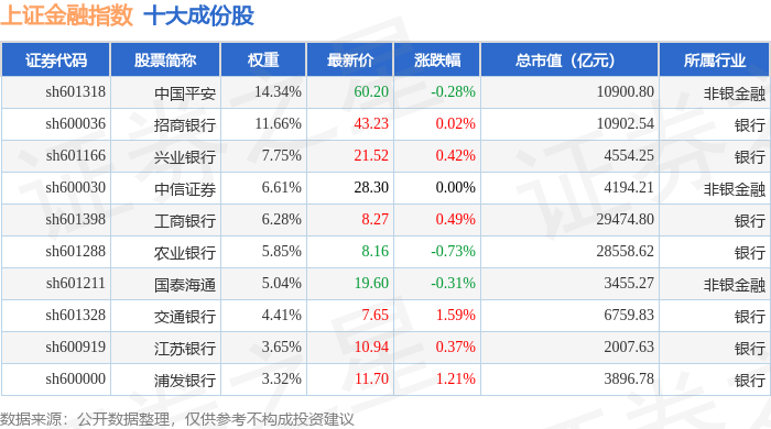 证券之星消息,11月20日,上证金融(000038)指数报收于5874.54点,涨0.31%,成交497.95亿元,换手率0.4%。当日该指数成份股中,上涨的有20家,中国银行以4.0%的涨幅领涨,下跌的有8家,华泰证券以2.57%的跌幅领跌。