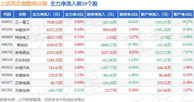 资金流向方面,上证民企(000049)指数成份股当日主力资金净流出合计47.61亿元,游资资金净流入合计13.0亿元,散户资金净流入合计34.61亿元。成份股资金流向详情见下表: