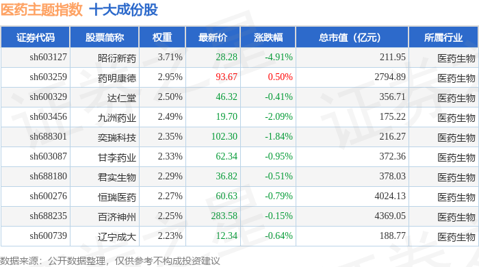 证券之星消息,11月20日,医药主题(000121)指数报收于8326.98点,跌0.79%,成交138.58亿元,换手率0.76%。当日该指数成份股中,上涨的有8家,泽璟制药以2.11%的涨幅领涨,下跌的有39家,昭衍新药以4.91%的跌幅领跌。