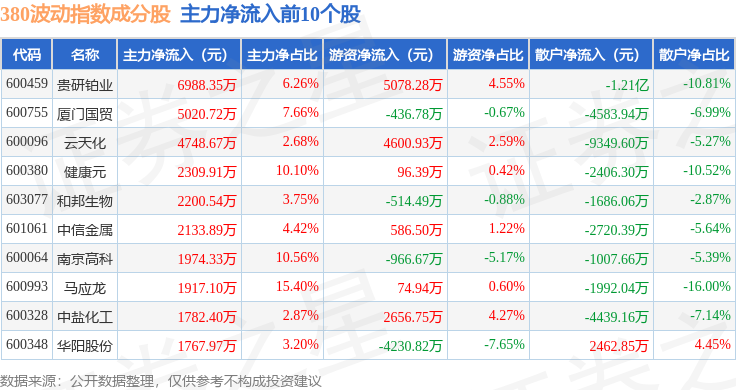 资金流向方面,380波动(000130)指数成份股当日主力资金净流出合计7.87亿元,游资资金净流入合计3.07亿元,散户资金净流入合计4.8亿元。成份股资金流向详情见下表: