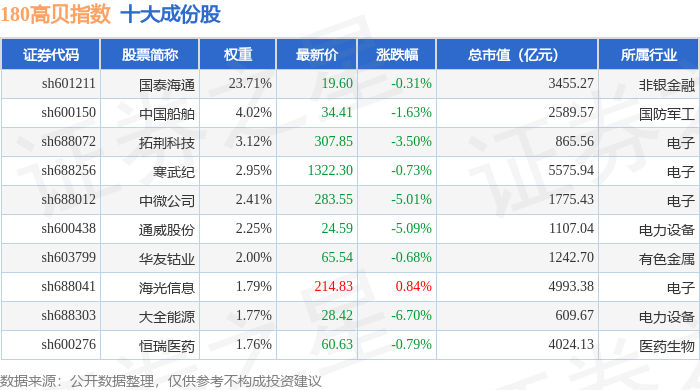 证券之星消息,11月20日,180高贝(000135)指数报收于6099.49点,跌1.02%,成交879.78亿元,换手率0.83%。当日该指数成份股中,上涨的有20家,首创证券以2.61%的涨幅领涨,下跌的有35家,大全能源以6.7%的跌幅领跌。