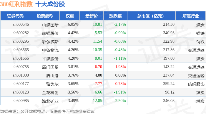 证券之星消息,11月20日,380红利(000150)指数报收于12048.08点,跌0.43%,成交58.6亿元,换手率0.9%。当日该指数成份股中,上涨的有12家,华发股份以2.31%的涨幅领涨,下跌的有17家,华阳股份以3.37%的跌幅领跌。