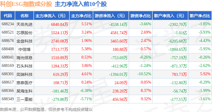 资金流向方面,科创ESG(000691)指数成份股当日主力资金净流出合计18.72亿元,游资资金净流入合计12.23亿元,散户资金净流入合计6.48亿元。成份股资金流向详情见下表: