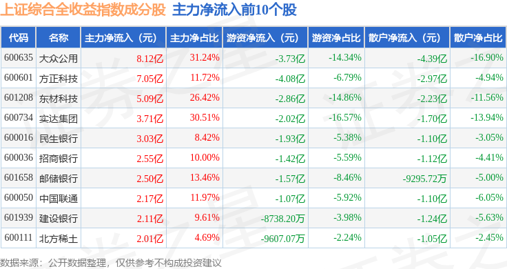 资金流向方面,上证综合全收益(000888)指数成份股当日主力资金净流出合计247.83亿元,游资资金净流入合计46.98亿元,散户资金净流入合计200.85亿元。成份股资金流向详情见下表: