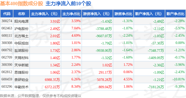 资金流向方面,基本400(000966)指数成份股当日主力资金净流出合计108.74亿元,游资资金净流入合计15.08亿元,散户资金净流入合计93.67亿元。成份股资金流向详情见下表: