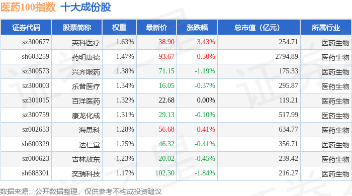 医药100(000978)指数十大成份股详情如下: