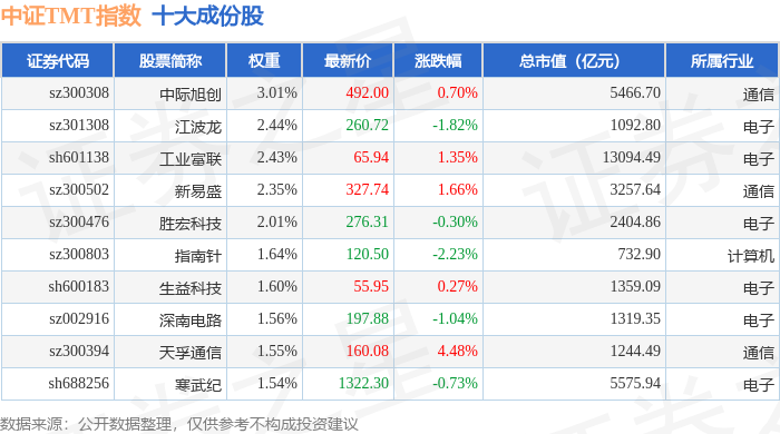 证券之星消息,11月20日,中证TMT(000998)指数报收于2744.29点,跌0.77%,成交1733.83亿元,换手率1.01%。当日该指数成份股中,上涨的有27家,天孚通信以4.48%的涨幅领涨,下跌的有73家,中微公司以5.01%的跌幅领跌。