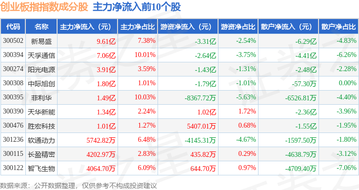 资金流向方面,创业板指(399006)指数成份股当日主力资金净流出合计39.25亿元,游资资金净流出合计6628.45万元,散户资金净流入合计39.91亿元。成份股资金流向详情见下表: