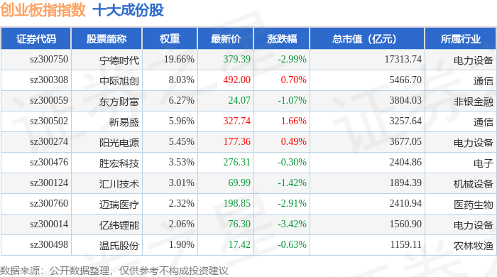 创业板指(399006)指数十大成份股详情如下: