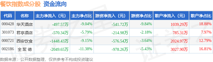 资金流向方面,餐饮指数(399238)成份股当日主力资金净流出合计4565.99万元,游资资金净流出合计2311.49万元,散户资金净流入合计6877.48万元。成份股资金流向详情见下表: