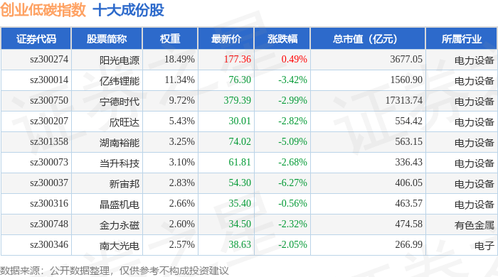 证券之星消息,11月20日,创业低碳(399259)指数报收于4966.34点,跌1.74%,成交577.81亿元,换手率3.13%。当日该指数成份股中,上涨的有11家,惠城环保以4.11%的涨幅领涨,下跌的有39家,新宙邦以6.27%的跌幅领跌。