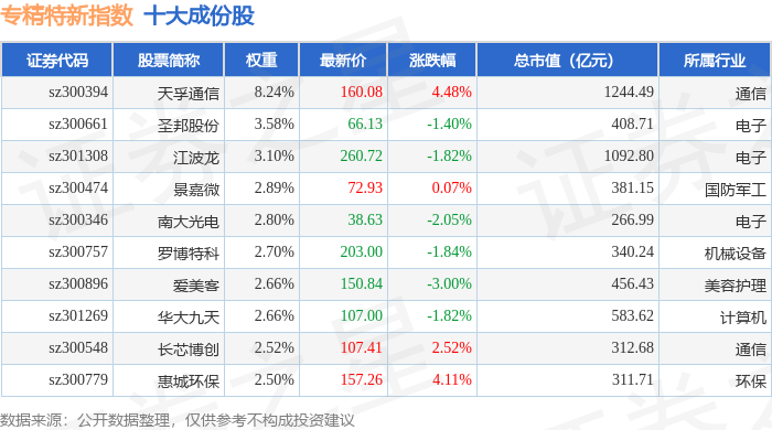 证券之星消息,11月20日,专精特新(399267)指数报收于2054.48点,跌0.53%,成交528.88亿元,换手率4.5%。当日该指数成份股中,上涨的有27家,天孚通信以4.48%的涨幅领涨,下跌的有71家,国科微以6.12%的跌幅领跌。