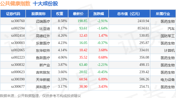 证券之星消息,11月20日,公共健康(399277)指数报收于2832.24点,跌0.07%,成交261.2亿元,换手率2.46%。当日该指数成份股中,上涨的有13家,天华新能以6.09%的涨幅领涨,下跌的有37家,创业慧康以4.04%的跌幅领跌。