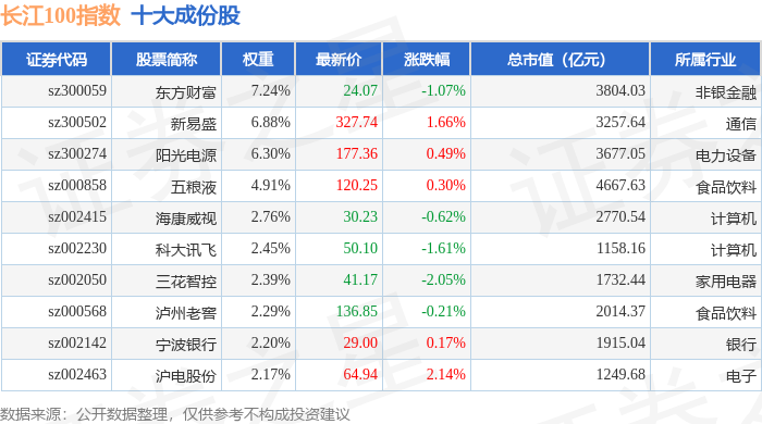 证券之星消息,11月20日,长江100(399278)指数报收于2054.48点,跌0.34%,成交1325.38亿元,换手率1.28%。当日该指数成份股中,上涨的有32家,天华新能以6.09%的涨幅领涨,下跌的有67家,杭氧股份以5.35%的跌幅领跌。