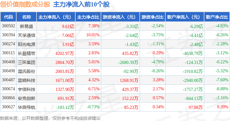 资金流向方面,创价值(399295)指数成份股当日主力资金净流出合计17.41亿元,游资资金净流出合计6.57亿元,散户资金净流入合计23.97亿元。成份股资金流向详情见下表: