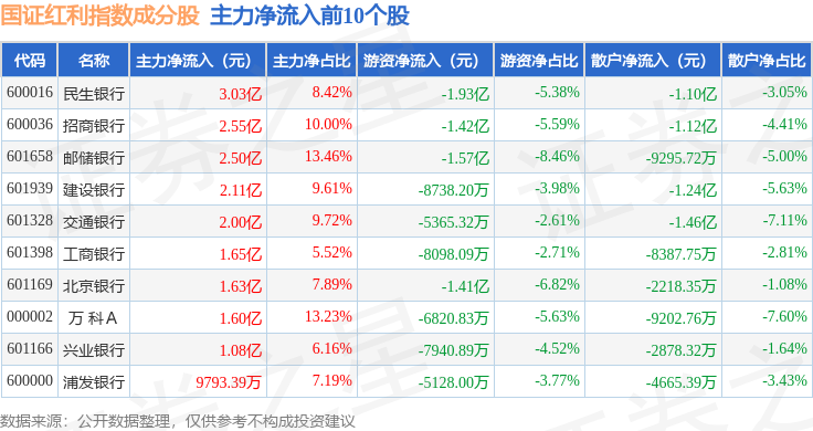资金流向方面,国证红利(399321)指数成份股当日主力资金净流入合计8.63亿元,游资资金净流出合计8.97亿元,散户资金净流入合计3359.92万元。成份股资金流向详情见下表:
