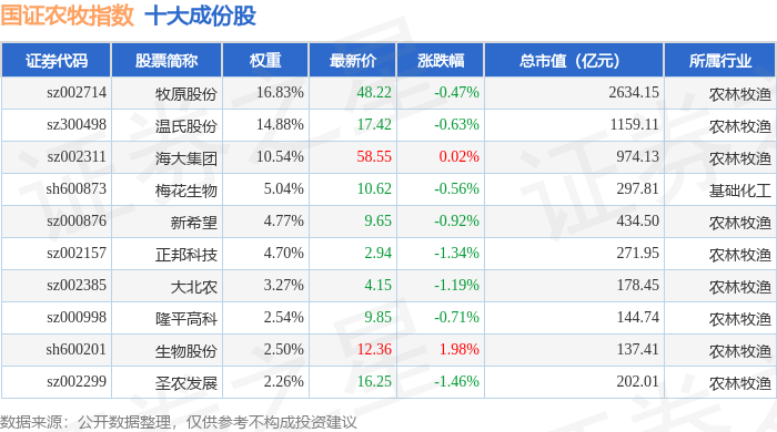 国证农牧(399435)指数十大成份股详情如下: