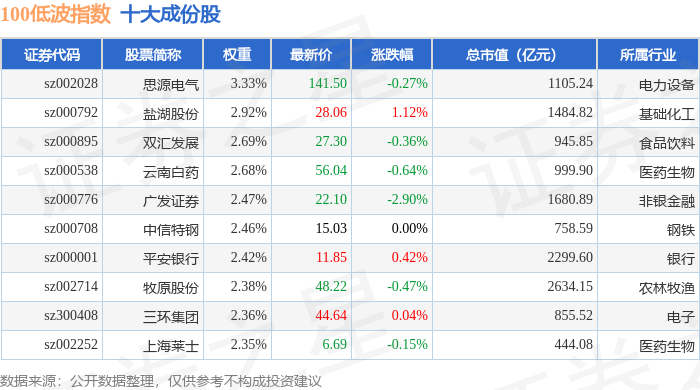 证券之星消息,11月20日,100低波(399645)指数报收于9469.7点,跌0.39%,成交404.43亿元,换手率0.66%。当日该指数成份股中,上涨的有12家,北新建材以5.69%的涨幅领涨,下跌的有37家,荣盛石化以2.92%的跌幅领跌。