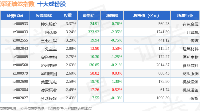 证券之星消息,11月20日,深证绩效(399655)指数报收于10780.84点,跌0.21%,成交704.61亿元,换手率1.15%。当日该指数成份股中,上涨的有33家,大中矿业以7.06%的涨幅领涨,下跌的有63家,杭氧股份以5.35%的跌幅领跌。