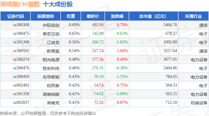 证券之星消息,11月20日,深成指EW(399659)指数报收于4560.91点,跌0.63%,成交4547.76亿元,换手率1.63%。当日该指数成份股中,上涨的有144家,航天发展以9.98%的涨幅领涨,下跌的有340家,多氟多以9.99%的跌幅领跌。
