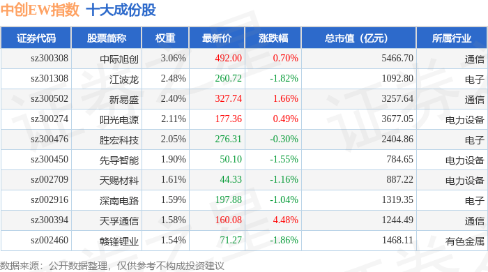 中创EW(399660)指数十大成份股详情如下:
