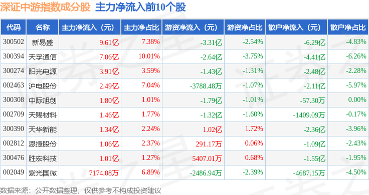 资金流向方面,深证中游(399705)指数成份股当日主力资金净流出合计45.81亿元,游资资金净流入合计3612.36万元,散户资金净流入合计45.45亿元。成份股资金流向详情见下表: