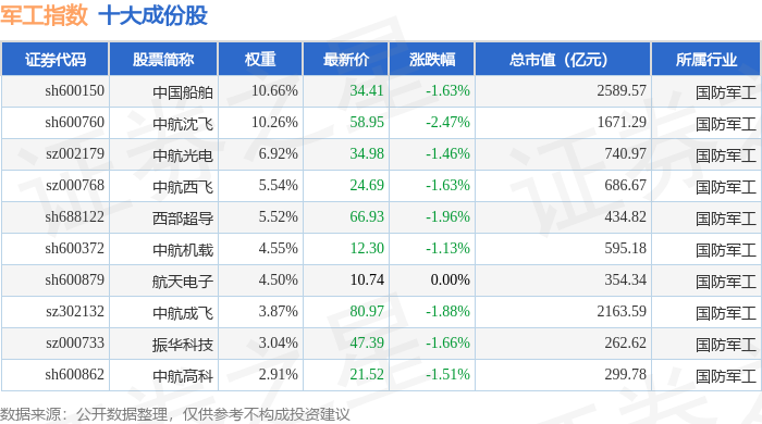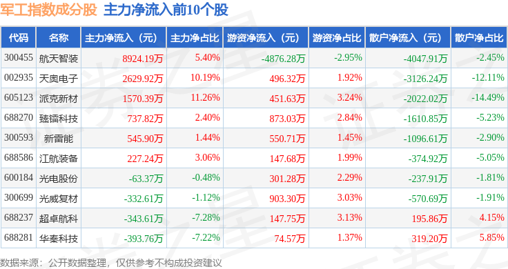 资金流向方面,军工指数(399959)成份股当日主力资金净流出合计11.57亿元,游资资金净流入合计3.5亿元,散户资金净流入合计8.07亿元。成份股资金流向详情见下表: