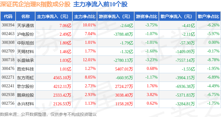 资金流向方面,深证民企治理R(470058)指数成份股当日主力资金净流出合计25.22亿元,游资资金净流入合计2.89亿元,散户资金净流入合计22.33亿元。成份股资金流向详情见下表:
